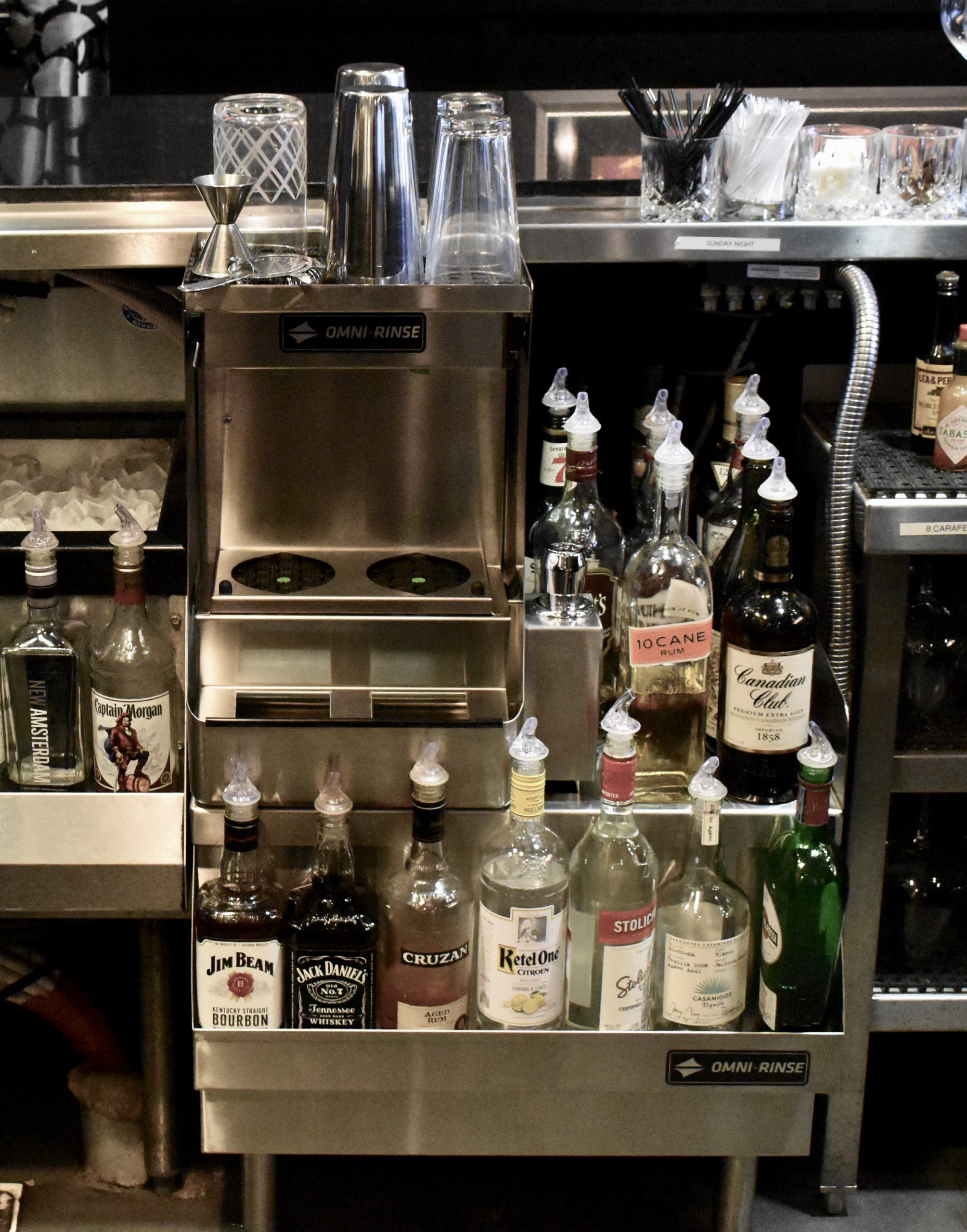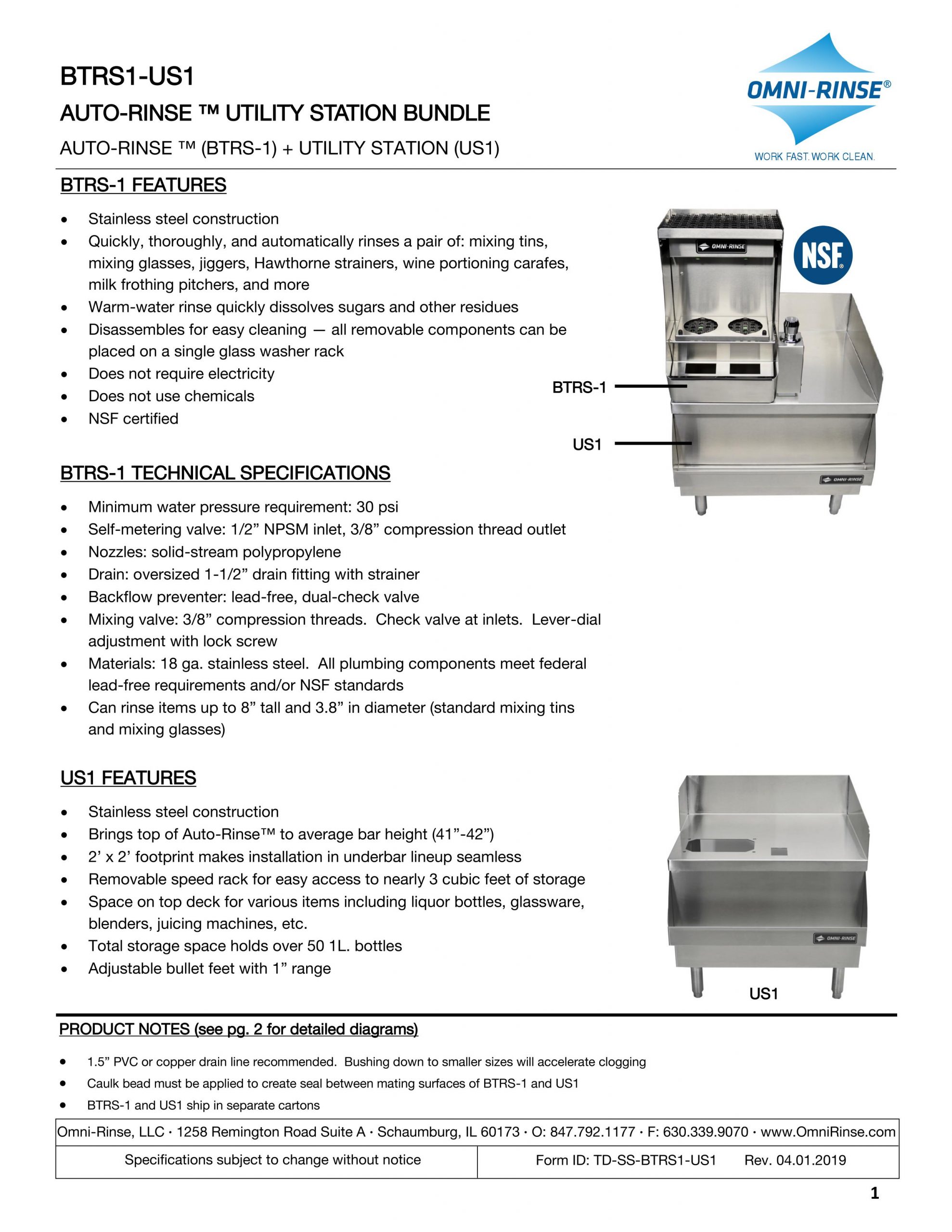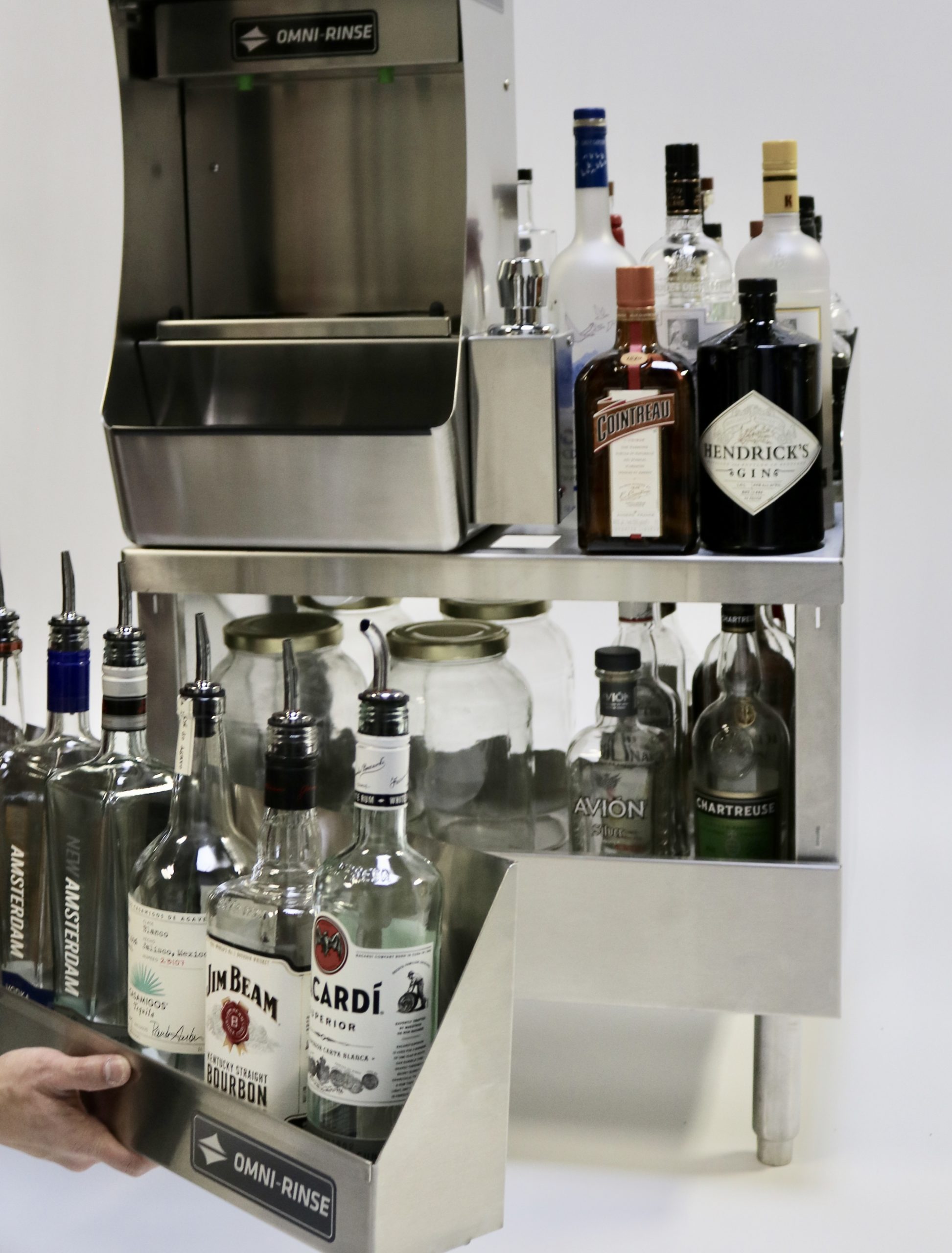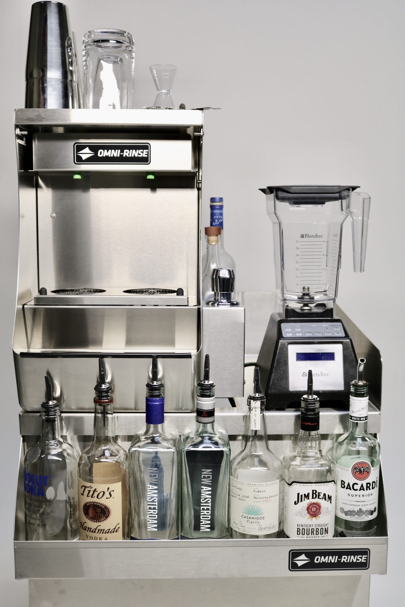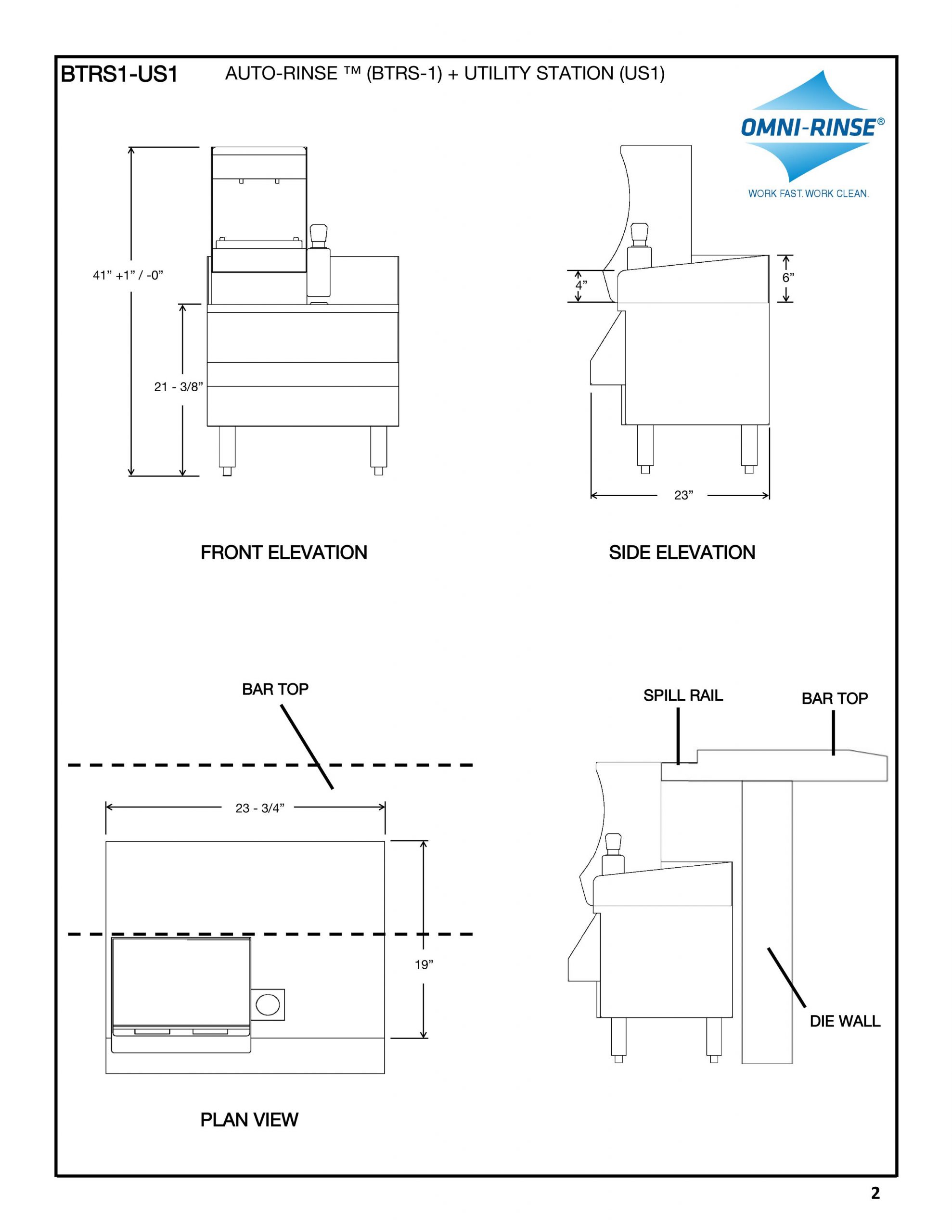 We made sure that the Utility Station would fit 99.99% of bar designs. Auto-Rinse™ mounted on top of the Utility Station has a total height of 41"-42", the standard height of most bars. When installed in a bar design, the top of the Integrated Rinsing System™ sits flush with most bar tops, allowing bartenders to take full advantage of the top of the unit to store their tools. The depth of the Utility Station is also universal. We made sure to make the unit 2' deep with the speed rack attached, so it lines up with standard underbar equipment.